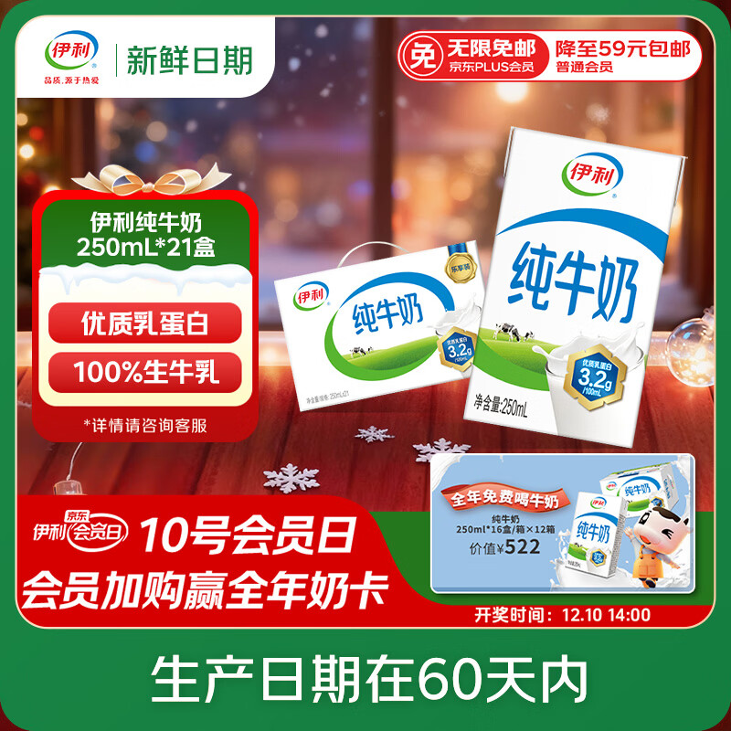包邮 伊利【新鲜日期】纯牛奶250ml*21盒 全脂牛奶 优质乳蛋白 礼盒装