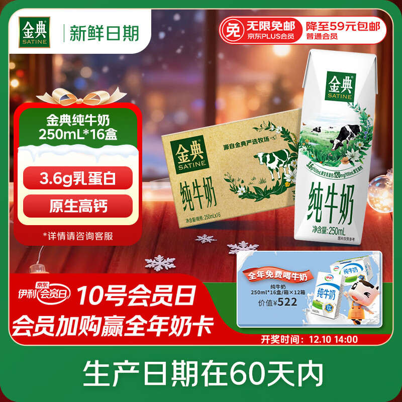 包邮 伊利【新鲜日期】金典纯牛奶整箱 250ml*16盒 3.6g乳蛋白 礼盒装